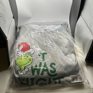 Cozy gray sweatshirt featuring the Grinch in a Santa hat. Perfect for holiday festivities.