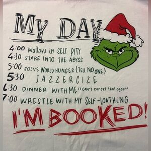 Playful tee featuring the Grinch with a humorous schedule. Red and green design adds a festive touch.