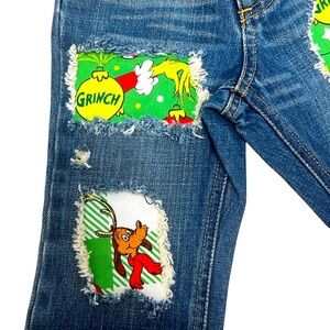 Grinch distressed jeans, size 18/24months handmade grinch distressed jeans never been worn 🎄 so stinking cute for Christmas even has grinch hair