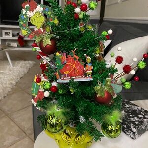 It's a Grinch Christmas tree. All decorated with Grinch family and very festive in a big GRINCH CUP
