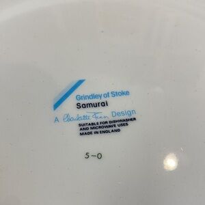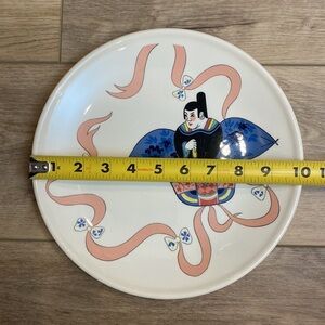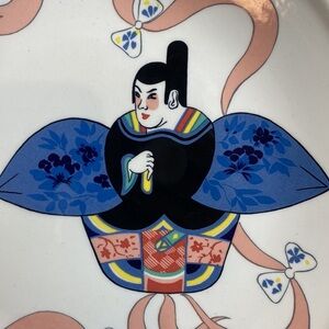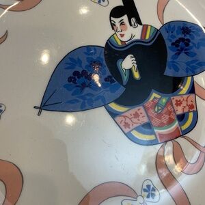 Rare vintage 80's Grindley of Stoke England Samurai Dinner Plate by Charlotte Finn. The design features a stylized lofi samurai with pink ribbon and blue bow accents. Some minor surface scratches as pictured, overall gently used and in great condition.