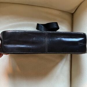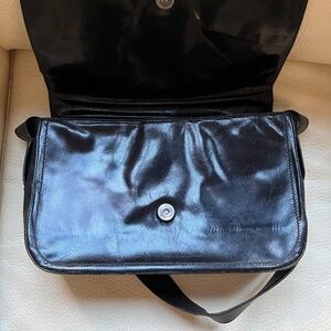 Glossed black leather shoulder bag, suede lining, zipped inner pocket. No visible signs of wear, in excellent condition. Width 7 3/4 in, length 11 3/4 in.