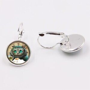 Grinning Cheshire Cat Glass Cabochon Silver Plated Handmade Leverback Earrings