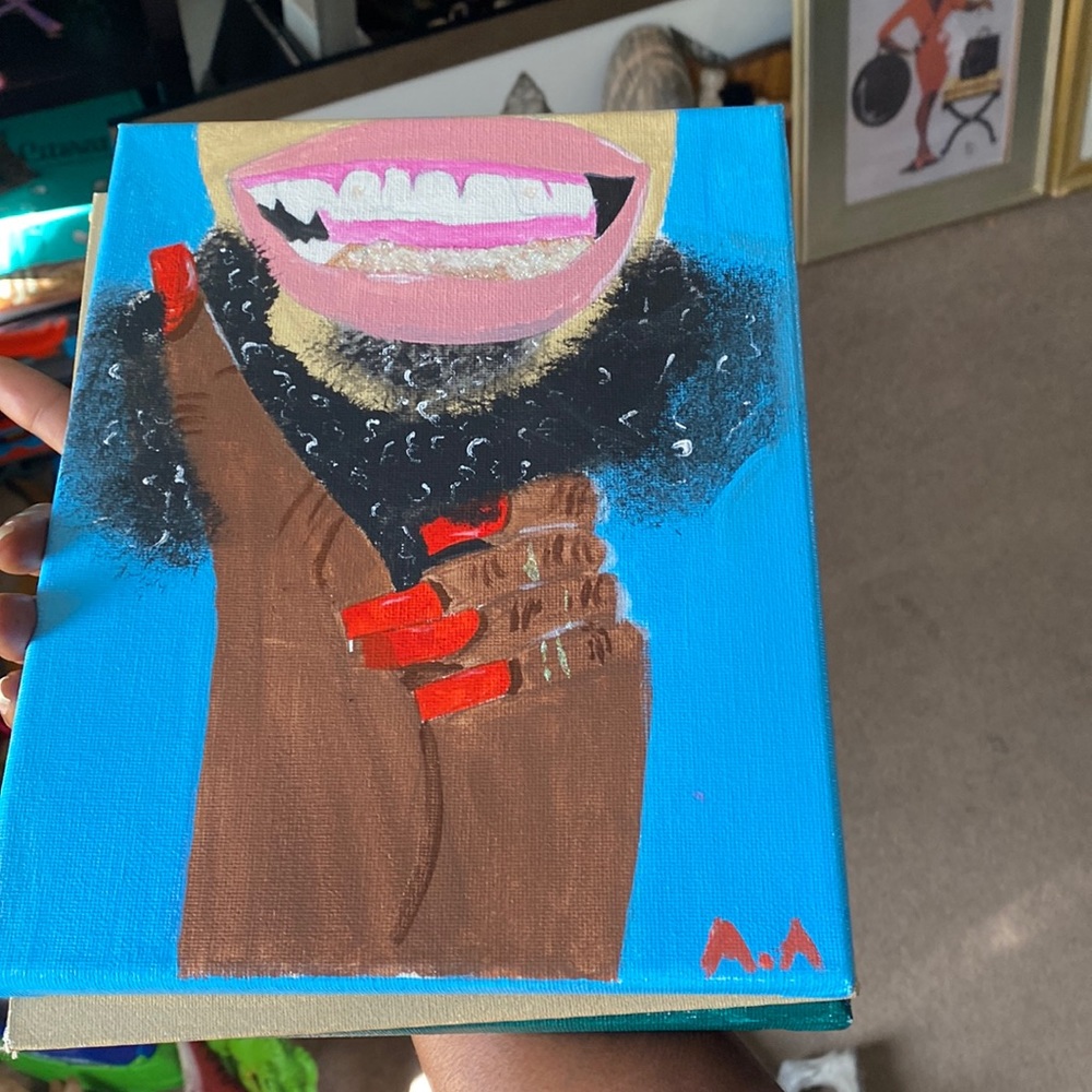 Hand painted out of acrylic paint illustrating hand gripping a beard painted by a 16-year-old
