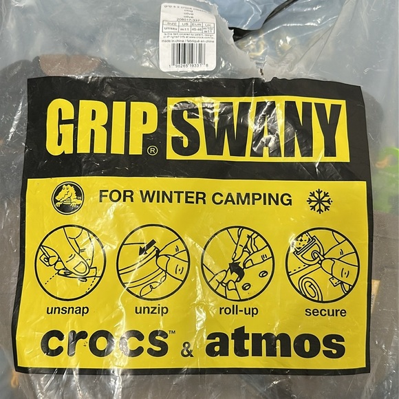 Brand new with tags โ rare collaboration between Grip Swany x atmos x Crocs! These All Terrain clogs are upgraded into rugged boots with insulated, fleece-lined covers and exclusive branding details. Includes limited-edition Jibbitz, heavy-duty soles, and a zippered design for all-weather versatility.