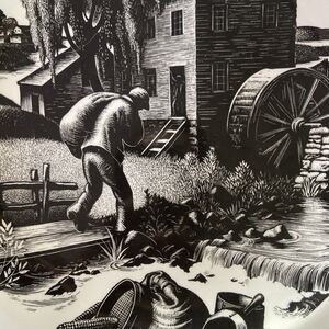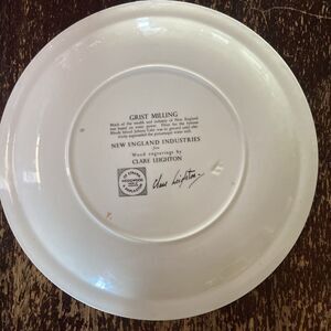 The Grist Milling Plate by Wedgwood Clare Leighton Design is a vintage, limited edition dinner plate featuring a black and white color scheme with a New England Industries pattern. Made of earthenware with a glossy finish, this 10.5-inch plate was manufactured in England in 1952. The plate showcases the theme of grist milling and is part of the New England Industries collection, inspired by wood engravings. It is a unique and collectible piece that adds a touch of history and artistry to any table setting.