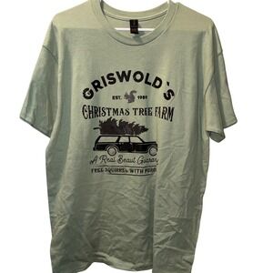 Griswolds Christmas Tree Farm graphic t shirt in light green. Short sleeves and crew neck are standard features of this casual tee. This shirt was made by me for a craft show. Shirts are new without tags.