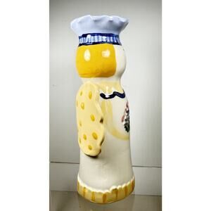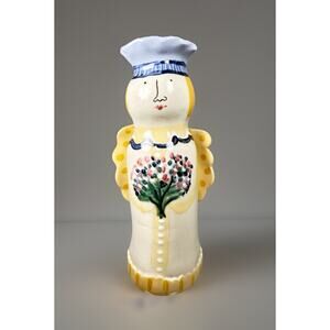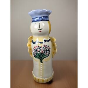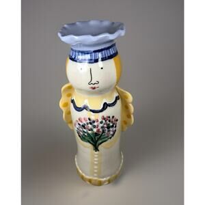 Adorable hand crafted ceramic pottery angel by Gritter and Van Noord/Heather Lane Pottery. Signed. Perfect to brighten up any space and bring some spring feel, this angel stands approximately 7.5 inches tall. She is hand painted and signed in lovely yellow blues and pinks she is holding a beautiful floral bouquet. She is a bit folk artsy.