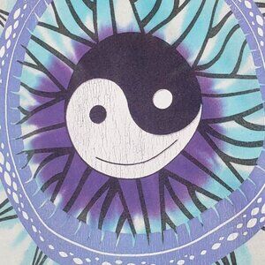 Griz Tie Dye Shirt Men's Yin Yang Smiley Face Jam Band Crunchy Hippie Boho. Grateful dead style spin dye pattern front and back. Back says "Know time like the present". Smiley face yin yang on front. Color: purple, blue, white. Size: Men's medium, approx. 21" armpit to armpit, 28" length mid shoulder to hem. *** In good used condition, please note some cracking on front graphics. B76 9/5/24