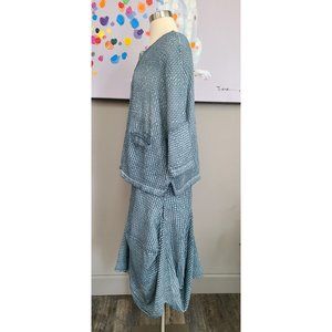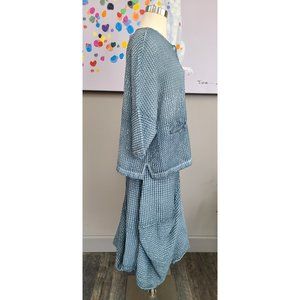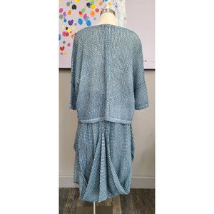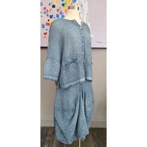Elegant blue skirt set by Grizas. Features a textured design. Includes a matching top and skirt.