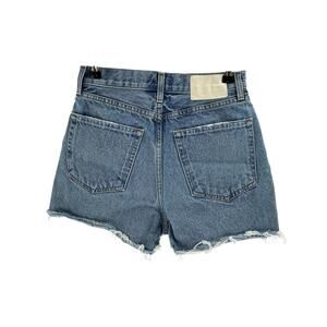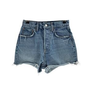 Grlfrnd 'Jules' Blue Cotton Super High Rise Vintage Short Size 26: button fly, 5-pocket styling, intentionally distressed design, frayed raw-cut hem on rigid denim fabric, measurements: 13 inch width x 13 inch length.