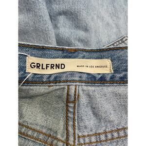 Grlfrnd 'Quinn' Blue Cotton High Rise 90'S Short Size 27: button fly, 5-pocket styling, intentionally distressed areas, frayed raw-cut hem.