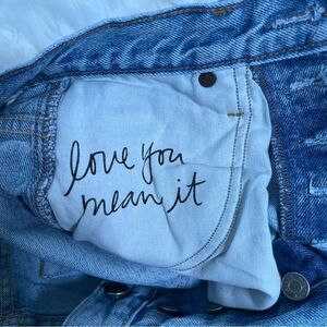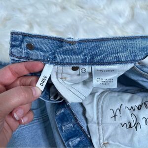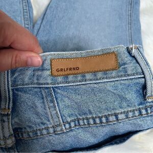 Great pair of lighter wash jeans by grlfrnd. Style dree. Mid to higher waisted with button front and raw hem design at bottom hem. Great preowned condition without any significant flaws. Lying flat waist approx 11.5” across and inseam approx 23” and front rise approx 10”. All measurements are approximate