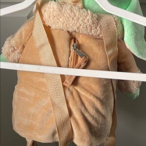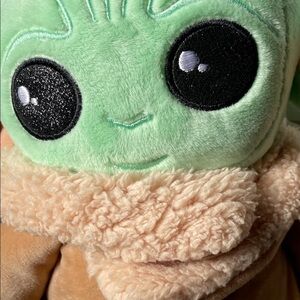 Soft green plush head and hands with tan cozy jacket. Comfortable and lightweight for anyone to carry and add to a Star Wars outfit.
