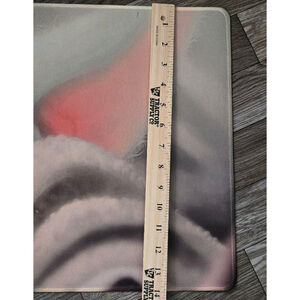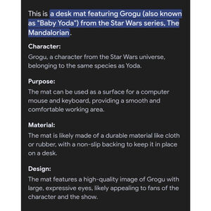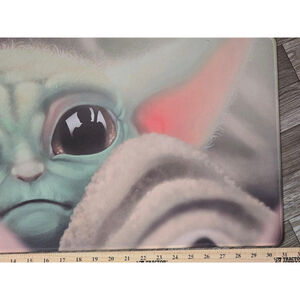 New with tags. This rectangular desk mat measures approximately 30" x 13.5". It features a high-quality image of Grogu ("Baby Yoda") from Disney's The Mandalorian. The mat is made of a smooth, cloth-like material with a non-slip backing. The image shows Grogu's face in close-up, with large expressive eyes. No visible imperfections. The mat is designed for use with a computer mouse and keyboard. Brand and model information are not visible.
