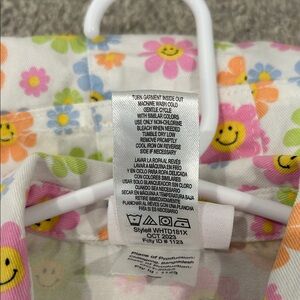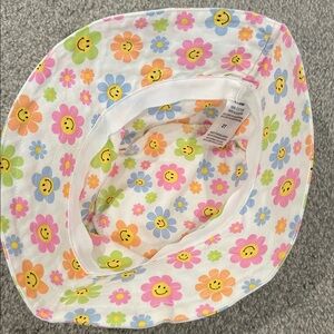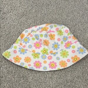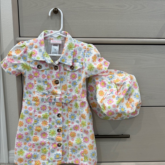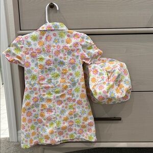 Adorable floral button-up dress with matching bucket hat. Features colorful flower patterns and brown buttons. Your toddler will love the fun print. Smoke free home. Hanger not included. Machine washable.