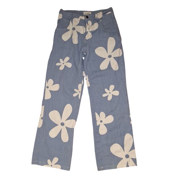 Step into a world of groovy vibes with these adorable light wash blue denim jeans! These jeans feature a charming white floral print, made up of cheerful daisies, perfect for adding a touch of whimsy to your wardrobe. With a flattering straight leg cut, they embody the essence of the Y2K aesthetic, while also giving off retro and 70s inspired vibes. Embrace your inner boho spirit with these bohemian style jeans, ideal for creating effortlessly chic streetwear looks. Whether you're heading to a festival, rocking out at a concert, or simply enjoying a peaceful day in the countryside channeling cottagecore energy, these jeans are sure to make a statement with their flower power appeal. Grab these stunning jeans now and let your style bloom!