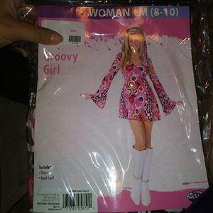 The Groovy Girl Costume offers a bright, colorful and fun adult outfit suitable for a wide variety of Halloween events. It comes with a dress and head scarf.
