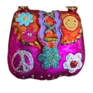 The glitter motifs (peace sign, daisy, smiley face) and the bright enamel finish point to a “groovy 60s hippie handbag” theme — part of a short-lived “fashion accessory ornament” trend that was especially popular in Neiman Marcus and Bloomingdale’s holiday lines around 2005–2010.