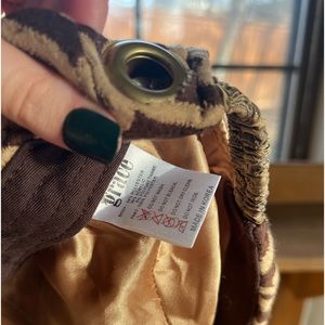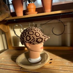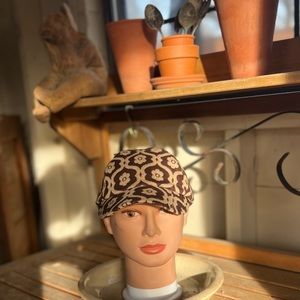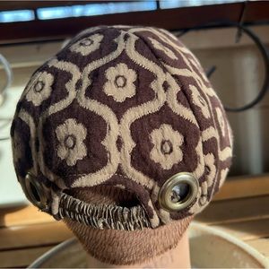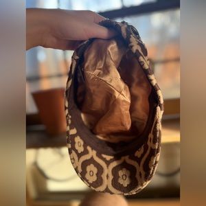 Elastic band in the back for stretch, soft velvety material, brown and tan daisies.