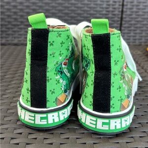 Kids Minecraft high-top sneakers featuring Creeper graphics and TNT blocks. The shoes are green canvas with black and gray accents, white laces, and rubber soles with “Minecraft” lettering across the back. Lace-up closure with reinforced eyelets. Shows normal wear on soles and some light scuffing, but overall in good used condition. Fun pair for any young Minecraft fan.