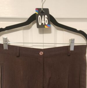 Kim Rodgers ladies brown stretch straight leg trousers. Classic two pocket, flat front zippered button closure. Size 10 P, 15 inch wide, 38 inches long.