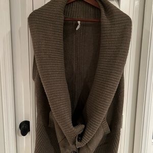 Assorted cardigans to keep you warm this winter: theory gray heavy cable knit w 1/2 sleeve, mpg long tan w pockets, Soyun heather brown sleeveless cowl neck w button front