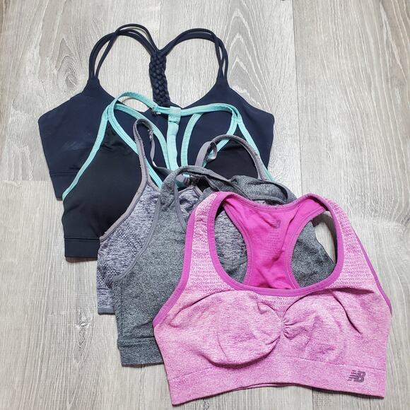 Five sports bras that all work well. I went from a 32 to a 34 and these are just a bit too tight on me now. Mix of brands. They all have some stretch. The two black bras have a thicker padding. The two gray bras have the standard thin inserts over the breast. The pink bra in missing the inserts but you could put some in if you want. It's got two layers of fabric so I've just used it the way it is with no problems.