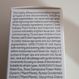 From the Box: "This highly efficacious formulation targets all types of skin discolorations, including hyper-pigmentation, sun spots and age spots while improving skin radiance and luminosity. Phyto-Complex ingredients Vitamin C from Kakadu Plum Extract and Glabridin from Licorice noticeable brighten facial skin.