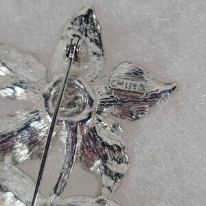This vintage Gruen brooch boasts a classic floral design with lilac enamel and sparkling rhinestones. It adds a touch of elegance and charm to any outfit, making it a perfect accessory for special occasions or everyday wear.