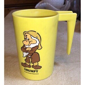This vintage red plastic mug features the beloved character Grumpy from the classic Disney film Snow White and the Seven Dwarfs. The round shape and yellow color of the mug make it a unique addition to any collection. The item stands at a height of 4 1/8" and is made of durable plastic material.