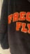 2 Piece Set Faux fur black pullover hoodie with front pocket, & elastic waist pull on flying Witch pajama / leggings pants. Frequent Flyer graphic is outlined in gold sequins.