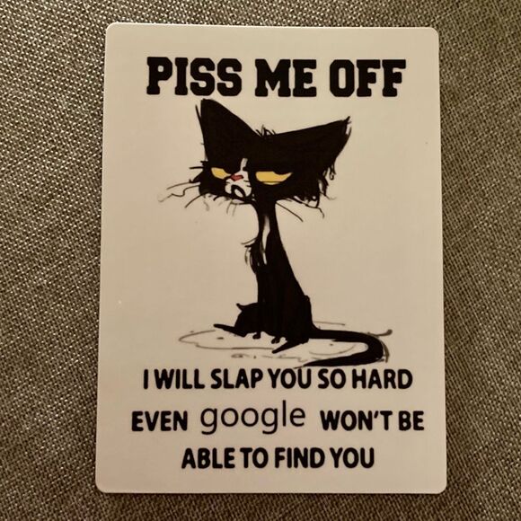 New. Grumpy cat magnet, “piss me off and I will slap you so hard even google won’t be able to find you.” 5.5x4”. Strong enough to hold notes and photos. *Reasonable* offers welcome.