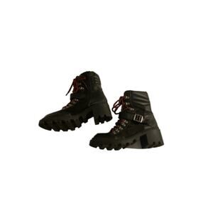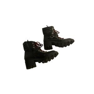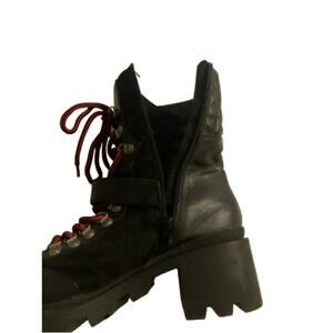 Level up your fall fashion with these badass combat-style moto boots by Lust For Life. Featuring rugged tread soles, buckle detail, red lace-up front, and padded ankle design. The chunky heel adds height and edge while remaining walkable. Perfect for grunge, alt, streetwear, or festival looks. Pre-loved and full of attitude.