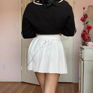 White tennis style pleated skirt with O-ring and chain detail. 2 snap buttons on front waistband for closure. Really cute and perfect for a grunge or white goth look!!