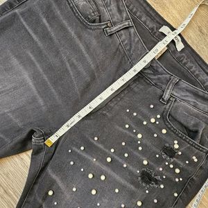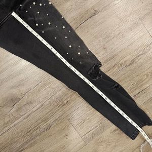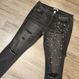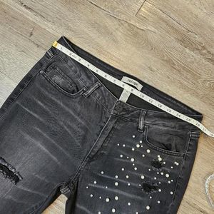 Grunge Ripped Knee Distressed Jeans Black Size 10 Edgy Glam Pearl Embellished
