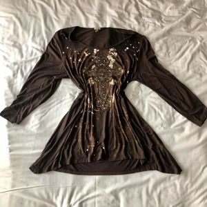 Sick chocolate brown top with rhinestones, cross, and gold filigree design. Asymmetrical hem, long sleeve, and the softest cotton ever. Y2K brand Reba, size XL shown on a small. Perfectly paired with a cropped vest and corset to snatch waist.