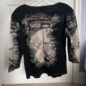 Super cool black grungy tee with white accents. Also had some red rhinestones. Sleeves are 3/4 arms length long. The tag says it’s an extra large but I wear a small-medium and it fits me perfectly.