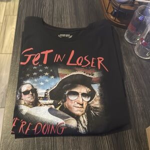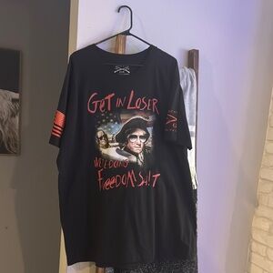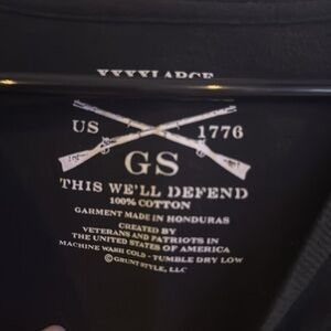 Black tee with white crossed rifles and text. Bold and patriotic design.