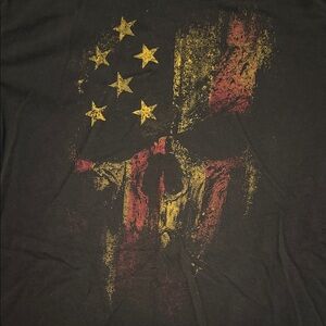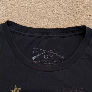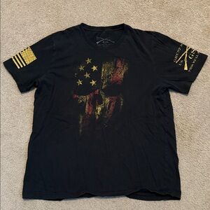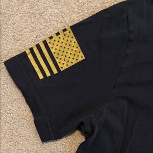 Black tee with gold patriotic graphics. Short sleeves. Bold and stylish.