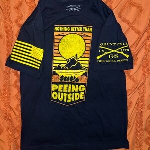 Navy blue tee with bold yellow graphic. Features outdoor theme with sun and mountain design. Comfortable and stylish.