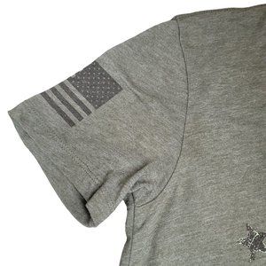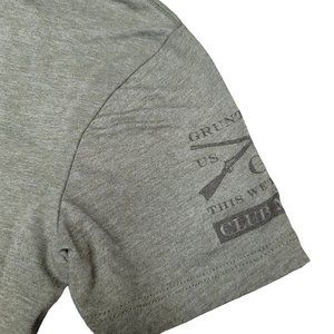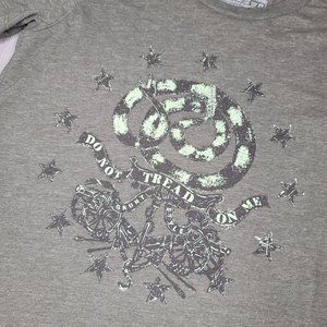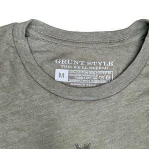 This medium-sized Grunt tee shirt features a bold "Don't Tread on Me" design in green and grey, perfect for expressing your independence and patriotism. Made from high-quality fabric for comfort and durability.