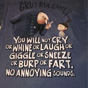 Text: "Gru's Rules!!! You will not cry or whine or laugh or giggle or sneeze or burp or fart. No annoying sounds."
