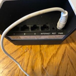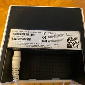 Gryphon mesh Wi-Fi router in sleek white finish. Includes matching white power adapter with attached cable. Designed for home network coverage and parental controls. Compact vertical design for easy placement.