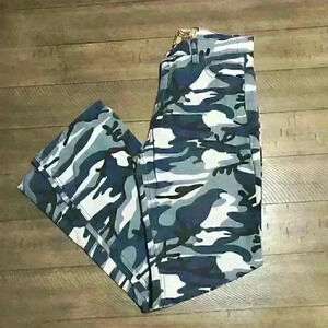 GS115 Blue, cream, black Camo Pants Sz 18 kids waist flat 14.5" Inseam 28"