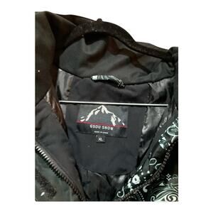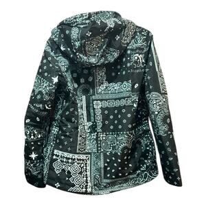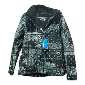 Stylish black and white patterned jacket with a hood. Perfect for casual wear.