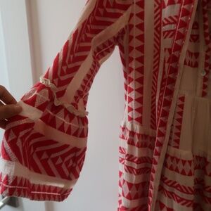 A standout piece from Guadalupe, this long-sleeve maxi dress features bold red geometric embroidery over a light cream base. The relaxed silhouette includes a tiered skirt, flared sleeves with delicate ruffle detailing, and a notched neckline with a coordinating tie belt for added shape. Subtle metallic threads add a touch of shimmer, while front and back pleated panels bring light movement. Whether you're heading to a beachside dinner or a daytime event, this dress brings effortless style and artisanal charm.