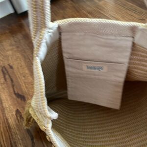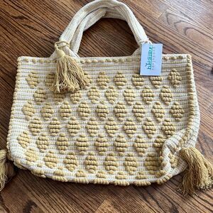 • Handwoven artisan tote with bold mustard and natural raffia accents