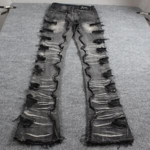 Item: Mens stacked flare jeans with heavy distressed patchwork design
