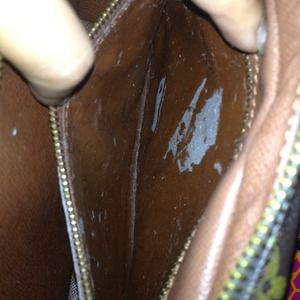 Used. Few times. New condition on the outside. Due to moisture and in my closet this vintage piece has a leather wearing off on the inside pocket.